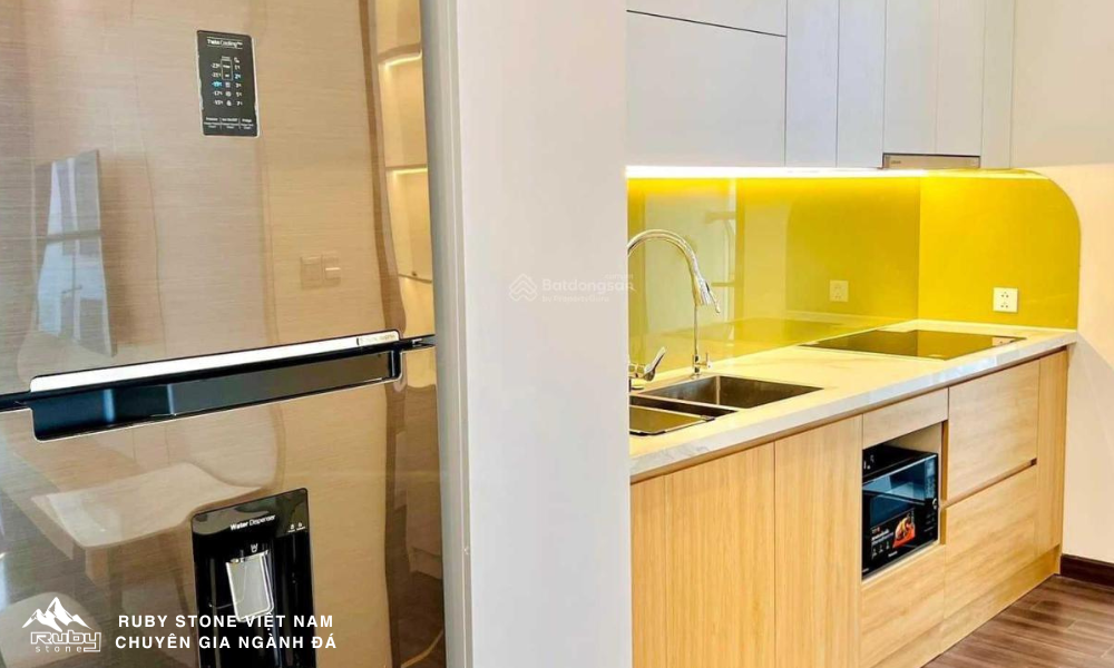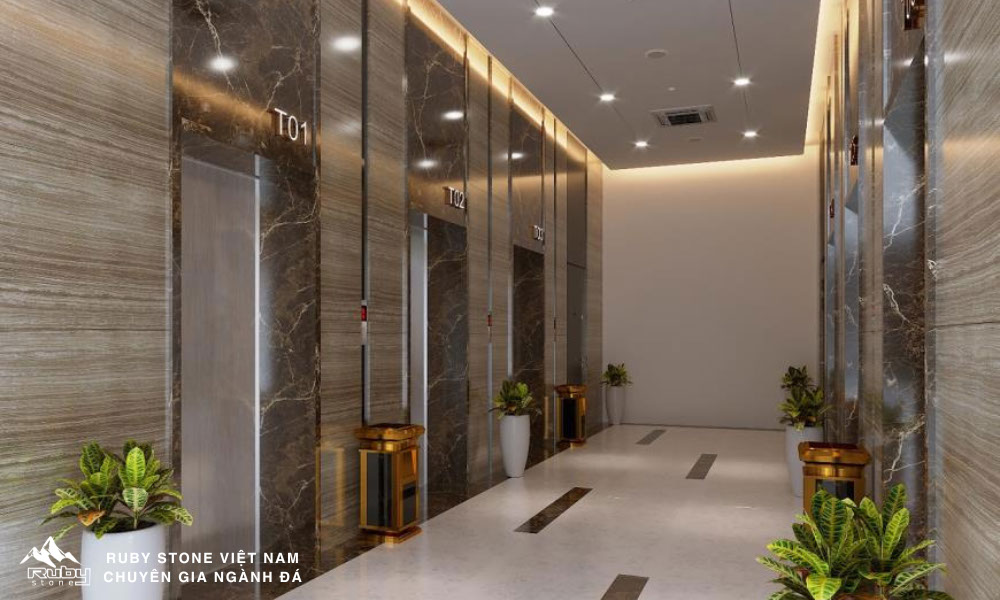 Các hạng mục thi công bao gồm: Ốp thang máy, bàn bếp, lavabo, ...