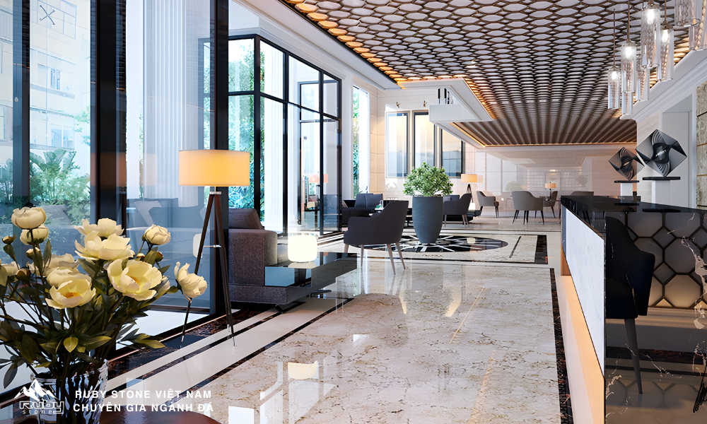 Hoa văn và đường nét của đá lát tiền sảnh cũng đóng vai trò quan trọng trong việc tạo nên vẻ đẹp thẩm mỹ cho không gian.
