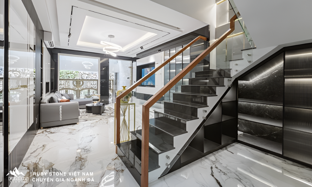 Đá cầu thang màu đen: Tạo nên vẻ đẹp sang trọng và quyền lực cho không gian nội thất, phù hợp với nhiều phong cách thiết kế.